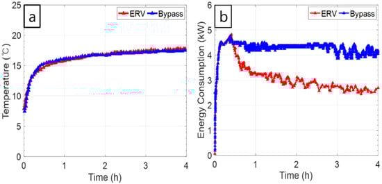 The EHP and ERV used in the field test were mounted in a test chamber. One ventilation mode was tested for a certain period, and the same test was repeated for the other ventilation mode. Figure 6 shows the indoor temperatures and energy consumptions during the test period for the ERV and bypass modes. In the initial minutes, the indoor temperatures rapidly increased in both cases, and the EHP was clearly operated at the maximum power during this time, as shown in the right frame of Figure 6. Subsequently, the temperatures increased slowly, suggesting proportional control. Over time, the energy-consumption patterns became distinct, and the EHP energy consumption in the ERV mode decreased.