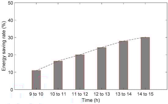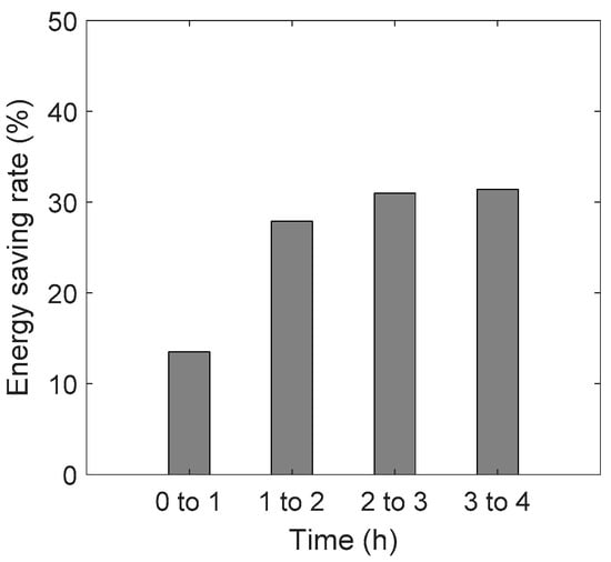 Figure 7 shows the energy-saving rates for the different intervals. The pattern of the energy-saving rates in the last 3 h matches the calibrated field-test results shown in Table 6. The energy-saving rate increased over time and became steady after a few hours. The ventilation loads remained the same over the test period for both modes, indicating that the proportion of the ventilation loads to the total heating loads may have increased during the test period. For instance, a portion of the energy supplied by the EHP could have been used for heating the chamber structure in the early hours, as the chamber was left at a low temperature of 2 °C before the test.