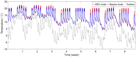 Figure 9 shows the average energy-saving rates over the simulation period for each hour of the day. As expected, the energy-saving rates for the ERV mode were higher than those for the bypass mode. Because the difference in the ventilation loads between the ERV and bypass modes was maintained over the test period, the difference in the energy-saving rates is ascribed to different proportions of the ventilation load to the total heating load, mainly due to the thermal effects of the building structure.