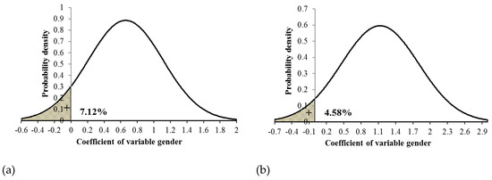 Varying effects of gender on e-bike collision severities. (a) Distribution of parameter estimates for F/I collision; (b) Distribution of parameter estimates for NI collision.