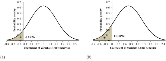 E-bike collision severity is found to be significantly affected by e-bike riders’ behaviors. Violation e-bike riders are 3.24 times more likely to be involved in F/I collisions and 2.78 times more likely to be involved in NI collisions. Distracted e-bike riders were 2.56 times more likely to be involved in F/I collisions and 2.04 times more likely to be involved in NI collisions. The result is straightforward because violation and distraction could increase e-bike riders’ crash risk. The parameters of this variable (distraction) follow normal distributions with (0.97, 0.63) for F/I collisions and with (0.77, 0.63) for NI collisions. As shown in Figure 2a,b, the distraction could increase the probability of F/I e-bike collisions for 93.82% e-bike riders, while for the other 6.18% e-bike riders, the probability of F/I e-bike collisions decrease. Similarly, distraction increases probability of NI e-bike collisions for 88.92% e-bike riders, while it decreases probability of NI e-bike collisions for 11.08% e-bike riders.