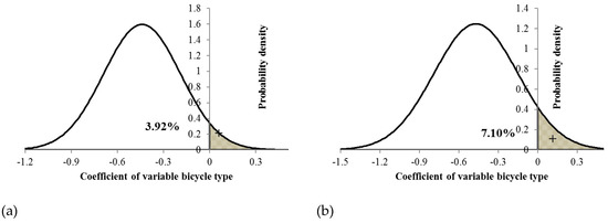 Varying effects of bicycle type on e-bike collision severities. (a) Distribution of parameter estimates for F/I collision. (b) Distribution of parameter estimates for NI collision.