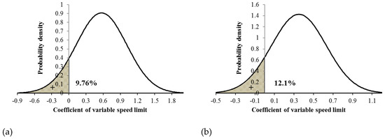 Speed limit showed significant positive relation with e-bike collision severities. According to the OR result, e-bikes are 1.79 times more likely to be involved in F/I collisions at a speed limit greater than 45 km/h than that at a speed limit less than 45 km/h. As for the NI collisions, e-bikes are found to be 1.88 times more likely to be involved in NI collisions at a speed limit greater than 45 km/h than that at a speed limit less than 45 km/h. The parameters of this variable were found to be random with a normal distribution with (0.57, 0.44) for F/I collision and (0.35, 0.28) for NI collision. The heterogeneous effect of this variable on F/I collisions and NI collisions can be found in Figure 4a,b.