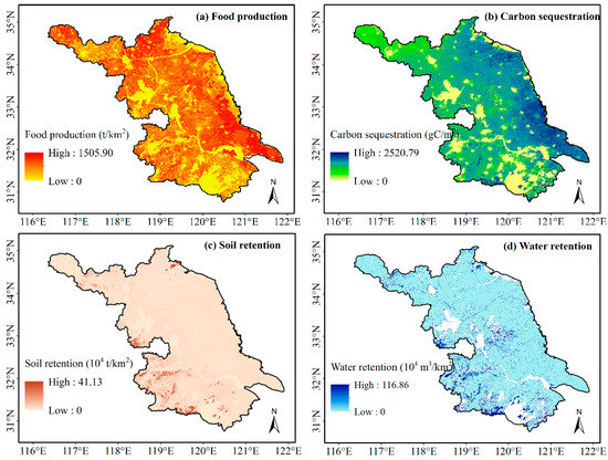 During the rapid urbanization process, large areas of non-construction land have converted to construction land, which has caused ecological and social problems in Jiangsu, such as food insecurity, urban heat islands, soil erosion, and water shortages [23]. Thus, we selected food production, carbon sequestration, soil retention, and water retention as indices to evaluate regional ecosystem services because these four indices have been frequently used to reflect ecosystem services [6,7]. Remotely-sensed data linked to different models were used to calculate values of the corresponding ecosystem services at a grid scale. The calculation methods were as follows: