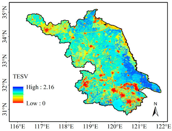 The spatial pattern of total amount of ecosystem services (TESV) in Jiangsu.