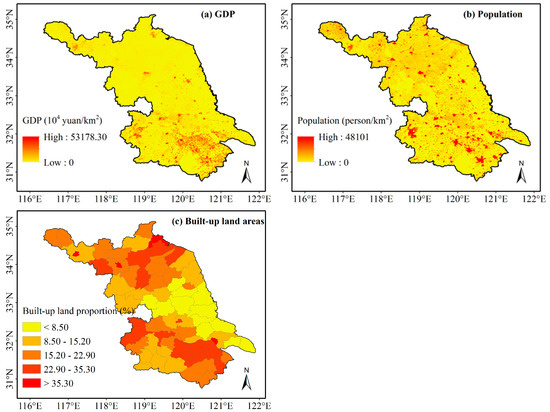 The degree of urbanization is an important factor to reflect the level of regional socio-economic development. In earlier research, the proportion of urban population was used as the sole indicator to measure urbanization. However, with the expansion of urbanization research, the measurement of urbanization is no longer limited to this single indicator, which encompassed aspects of society and economy, such as economic urbanization, population urbanization, and land urbanization. Following Peng et al. [7] and Wan et al. [20], three common indices were selected for analysis in this study: GDP per unit area (GPUA), population per unit area (PPUA), and built-up land proportion (BULP). Each of these indices reflect a different aspect of urbanization. The gridded GPUA and PPUA data were sourced from http://www.ecosystem.csdb.cn/. Both GPUA and PPUA in a county were allocated to each grid according to the weight of land use types and night lighting data. The BULP was calculated as the proportion of construction land in a county according to the Statistical Yearbook of Jiangsu.