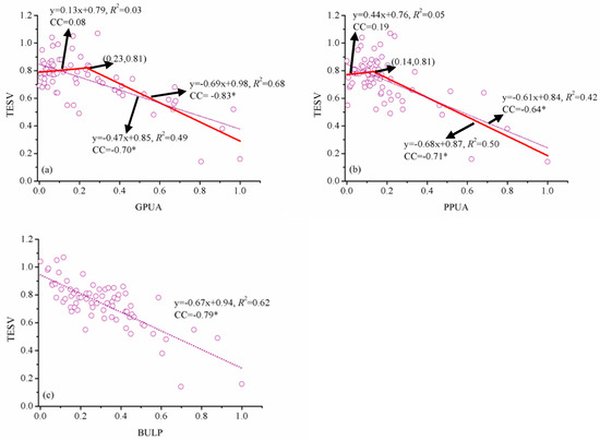 The relationship (a) between TESV and normalized GPUA, (b) between TESV and normalized PPUA, and (c) between TESV and normalized BULP in Jiangsu. Note: the results with an asterisk symbol indicate significant at the 1% level. CC indicates the Pearson correlation coefficient.
