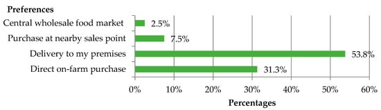 As can be seen in Figure 1, with regard to the manner and place of purchase from local farmers, most shops prefer direct delivery to the premises (53.8%), a preference that is slightly greater in the medium-sized towns; this is followed by direct on-farm purchase (31.3%), especially in the small towns (50%), followed by the big ones (29.6%), a percentage that is much lower in the medium-sized towns (12.0%).