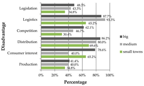 Among the limiting factors of marketing through SFSCs, no single food chain was deemed to be relevant by over 20% of the farmers interviewed. Nonetheless, with regard to the issues presenting a medium or high level of incidence (values from 3 to 5), we can highlight distribution costs (79.3%), logistics (62.2%) and a lack of interest by consumers (60.5%). Lastly, competition in the sector also scores a high value (47.5%). As can be seen in Figure 2, on considering the size of towns, the lack of interest by consumers is an issue of greater concern in the big towns (78.6%), likely due to the lack of connectivity between cities and countryside. Furthermore, the distribution costs associated with time, labour and fuel (86.2%) and competition in the sector (62.1%) in the big cities are also considered to be relevant in relation to the medium-sized towns (80% and 46.7% respectively). As is common in this type of farming, the vast majority believe that logistics constitutes one of the biggest disadvantages in the big- and medium-sized cities (87.7% and 93.3%) in relation to the time required to organize small orders, to cover producers’ markets throughout a full day, etc. For the small towns, results indicate a serious lack of consumer interest as the main problem. The remaining issues are given equal importance in all the different localities.