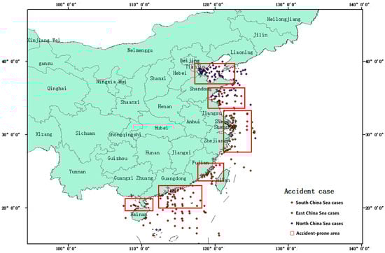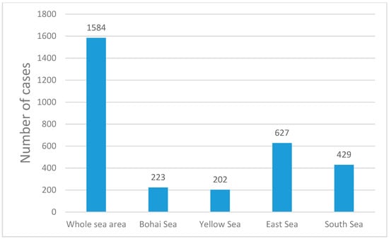 According to incomplete statistics, since 2016, there have been hundreds of major maritime traffic accidents in the Bohai Sea area, accounting for 10–15% of traffic accidents in coastal areas across the country. Although it has declined, compared with previous years, it is still at a high level. Among them, the damaged ships in the accident were mostly in Shandong, Liaoning, and Hebei. Figure 1 and Figure 2 show the distribution map of the sea search and rescue cases in China in 2017 and the histogram of case data.