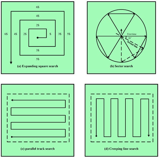 Next, we need to determine which search method to use. Indeed, there are several types of plotting techniques. For example, we have the extended square search pattern, sector search pattern, creeping line search, parallel sweep search [30], and others (see Figure 5). To determine the path and sweep width values, the parallel sweep search must be the most suitable search method.