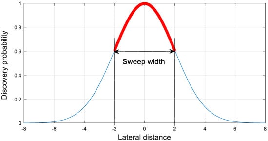 Sweeping width refers to the effective distance that the detector can detect the target of search and rescue in a specific search and rescue environment. It is an important indicator of the effectiveness of search and rescue operations. For the calculation of sweeping width (W), it is necessary to obtain statistical analysis of a large amount of experimental data and real case data [31,32]. From a geometric point of view, the sweep width satisfies the horizontal curve (see Figure 6), that is, the cumulative detection probability curve based on the lateral distance.