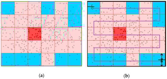 In this paper, the “cell iterative search” method [33] is used to select the optimal search area, which is the area with the highest search success rate, and then calculate the inclusion probability of the area for the search target. Figure 7 shows the probability distribution (see Figure 7a) and search method (see Figure 7b) of the optimal search area. When the POC is large enough, the probability that the search target exists in the search area at this time can reach 100%. However, at this time, the search area is often large, which makes the search resources unable to perform a full effective coverage search on the search area, and the POD becomes lower, and finally, a lower search success rate is obtained. When the search area is small, the search resource can perform a full coverage search on the search area, so that the POD is large. However, at this time, the POC is low, due to the small area, and finally, a low search success rate is obtained. Therefore, to improve POS, we must start with both POC and POD.