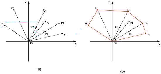 Step 1. Place all the points in the Cartesian coordinate system and use the point with the smallest ordinate as the origin (Such as P0 in Figure 8a). Here, the Mercator projection method is used to convert the latitude and longitude coordinates into Mercator projection coordinates. The conversion formula is as follows: