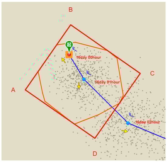 Taking an accident case in Bohai as an example, this paper first randomly generates 500 points according to the Monte Carlo method [34,35], each point represents a location where a search and rescue target may exist at a certain moment. Then, according to the Graham scan algorithm and the minimum rectangle generation algorithm, a rectangular search area containing all the scatter points is generated.