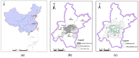Wuhan regional distribution map. (a) Location of research area. (b) Distribution of centre city, functional area, and new urban area. (c) Distribution of built-up and metropolitan development areas.