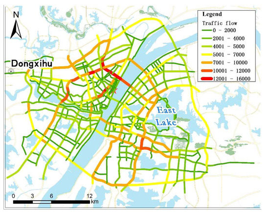 In the formula, is the carbon emission of the nth street in the ith district. and denote the factors of the nth street. signifies the total carbon emissions of the ith district. For agricultural carbon emissions, and represent the cultivated land area and population in the nth street. They are calculated using land coverage data and population survey data, respectively. For residential living and waste disposal carbon emissions, and represent the residential living area and population. Residential living area is calculated using geographical units, which is composed of 6049 residential areas in Wuhan. For transportation carbon emissions, and refer to road areas and traffic flow, respectively. Traffic flow data [32] is demonstrated in Figure 3. If the traffic flow data is missing, the buffer zone of the total population in the 2 km around the road is used as an auxiliary factor to determine the weight of roads for transportation carbon emission.