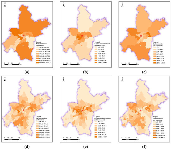 Carbon emission distribution in Wuhan. (a) Carbon emission at district scale. (b) Carbon emission intensity at district scale. (c) Carbon emission per capita at district scale. (d) Carbon emission at street scale. (e) Carbon emission intensity at street scale. (f) Carbon emission per capita at street scale.