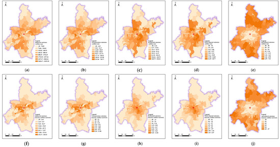 Total amount and intensity of carbon emissions of different sectors. (a) Industrial carbon emissions. (b) Transportation carbon emissions. (c) Residential carbon emissions. (d) Waste disposal carbon emissions. (e) Agricultural emissions. (f) Industrial emission intensity. (g) Transportation emission intensity. (h) Residential emission intensity. (i) Waste disposal emission intensity. (j) Agricultural emission intensity.