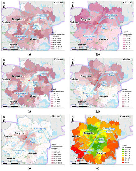 Spatial distribution of indicators and corresponding GW correlation coefficients. (a) GDP. (b) GW correlation of GDP. (c) Industrial land area. (d) GW correlation of industrial land area. (e) Population density. (f) GW correlation of population density.