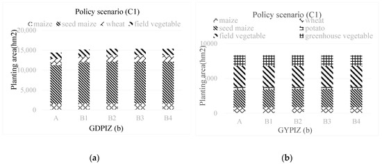 The different scenarios reveal the changes in the crop-planting structure of typical irrigation zones (Figure 2, Figure 3, Figure 4 and Figure 5). Compared with scenario A, the area of seed maize and maize will increase, but the proportion of seed maize will be higher in other scenarios in the GDPIZ with the TECI improved. There are two reasons. One is that water resources are the constraint on agricultural production in the GDPIZ, when it becomes the limiting factor, farmers will expand the cultivated area and increase the area of crops that have a higher net income of per unit water. The other is that the water consumption and irrigation cost of seed maize will be reduced with the TECI improved, and the net income of per unit water will be higher than that of maize. Similarly, in the GYPIZ, farmers will choose to grow more field vegetables in scenarios B and C2, and they will slightly increase the area of potato in scenario C3.