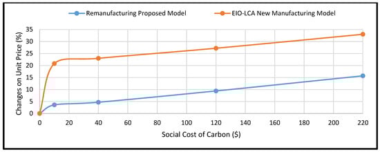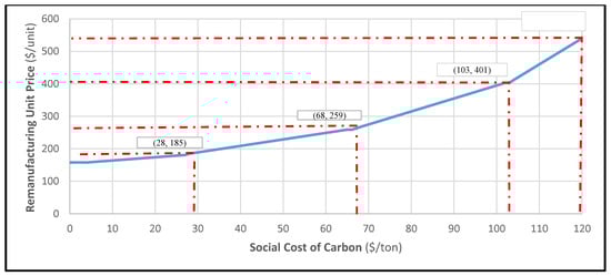 In the case of not considering a carbon tax, the unit price was $212 with a margin of profit estimated at 26.40% for a $288 selling price, in line with the current refurbished market price [87], while a USEPA-recommended $40/ton CO2 equivalent (tCO2e) tax decreased the profitability to 19.10%, assuming a fixed price for remanufacturing of $233 per unit [78]. The results obtained are shown in Figure 2, which demonstrates the network patterns of returned products through the reverse logistics (RL) network. The total remanufacturing cost was $233 per unit, and this devolved model was $116.99/unit under the current market price. The emission quantity was 0.07 tCO2e per unit. Comparing remanufacturing results to the EIO-LCA demonstrated that remanufacturing emission volumes were 0.084 tCO2e per unit lower than new manufacturing. Figure 3 exhibits the effects of the social cost of carbon on the unit price by comparing the developed remanufacturing model and the EIO-LCA manufacturing model for the new manufacturing producer prices over a range of proposed SCC values according to a recent U.S. government study, and at $220 per ton as used by Moore and Diaz [89]. Therefore, existing approaches used different carbon policies.
