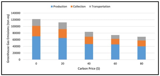 The methodology employed herein was a mixed-integer linear programming (MILP) platform for reverse supply chains with embedded GHG emissions to determine the ideal flow of units between multiple remanufacturing centers in a RSC; this will maximize net profit and minimize GHG emissions, energy use, product recovery, transportation, labor, and rent costs. Factors determining expenditure were investigated with data drawn from actual sites within the Boston region. The value of the direct carbon tax used to estimate the GHG emissions varied in accordance with ranges presented at the 21st Conference of the Parties to the UNFCCC in Paris [4], the U.S. Interagency Working Group [77], and the U.S. Environmental Protection Agency [78]. This will regulate how the proposed policy influences profit limitations on remanufactured items. The consumption and expenditures data were taken from the 2012 Commercial Buildings Energy Consumption Survey (CBECS) and the 2010 Manufacturing Energy Consumption Survey (MECS) databases [79,80], based on the New England census division. A deterministic model with minimum shipment constraints was developed; the minimum shipment assumption was 5 units of A/C based on the collection centers’ phone interviews. The remanufacturing outcome was then compared to the deflated market price through the use of a consumer price index presented in terms of 2002 dollars [81], and that outcome was assessed through the use of the economic input-output life cycle assessment (EIO-LCA) model—a strategy for the estimation of the materials and energy resources necessary for environmental emissions produced through economic activities [82]. The sector of the EIO-LCA that was selected was the U.S. 2002 benchmark for the manufacturing of equipment for air conditioning, refrigeration, and warm air heating. Then, applying an orthogonal array testing allowed for full consideration of all possible inputs in each system. A deterministic model with relaxation constraints was developed to consider the impact of carbon price uncertainty on supply chain network decisions, and considered 13 different scenario groups for carbon pricing that deployed the same demand scenarios. Table 3 presents a summary of the solutions of the model, providing a range of carbon prices. The application of three varying configurations generated carbon prices between $0 and $120. LINGO 13.0 was used to identify a solution to the problem of optimization.