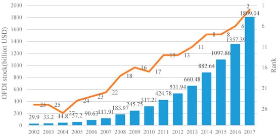 In the context of the knowledge economy, intellectual property has received increasing attention from all around the world. Since the entry into force of Trade-Related Aspects of Intellectual Property Rights (TRIPS) in 1995, developing countries have greatly strengthened the intellectual property rights protection (IPRP) system in response to the increasing pressure from developed countries. As the largest developing country in the world, China is striving to build a complete legal system for IPRP. Related to China’s “Go Global” strategy, the extent of China’s expansion is deepening accompanied with a significant increase in the amount of international trade, foreign direct investment (FDI) and outward foreign direct investment (OFDI). The detailed amount and annual flow of OFDI from 2003 to 2017 are shown in Figure 1 and Figure 2. From the perspective of OFDI stock, China’s OFDI has been increasing year by year, reaching 1809.04 in 2017, ranking second. However, from the perspective of annual flow, compared with 2016, the OFDI flow in 2017 decreased by 19.3% [1].