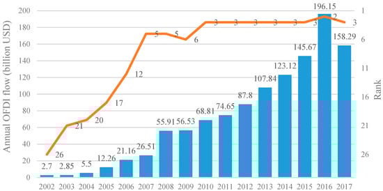 The annual flow and rank of China’s outward foreign direct investment (OFDI).