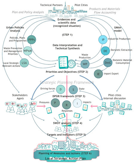 The methodology proposed is based on the integration of the UM concept in a strategic planning process for the definition of urban strategic plans for waste prevention and resource management. It seeks to ensure that our cities will shift towards more sustainable production and consumption patterns, by focusing on both (i) the planning tools (e.g., quantitative and qualitative analysis, specific technical tools to support decision-makers, etc.) and processes considered in the whole planning process and (ii) the engagement of stakeholders and participatory approaches that should be carried out in order to secure the legitimacy, functionality, and endorsement of the plan. The methodology principles are shared among all the pilot municipalities. However, specific local characteristics that might influence their metabolism, such as the level of economic development, environmental and climate factors, as well as social, cultural, and political issues, are implicitly considered in the process, since this kind of local knowledge is guaranteed by the involvement of local actors and stakeholders.