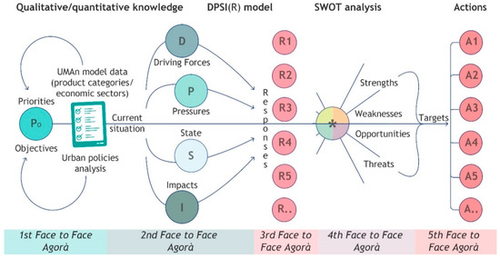Following the above methodology, each pilot city developed its own strategic plan for waste prevention and resource management. A total of eight strategic plans were thus implemented, composed of all the elements explained in the steps from 1 to 6. The proposed planning process make use of both qualitative (e.g., analysis of current policies, DPSIR, and SWOT analysis) and quantitative analysis/methods (e.g., MFA, indicators, and targets). Qualitative ones were intended to be used to gain an understanding of underlying reasons, perceptions, opinions, and motivations for the development of the strategic plans, as well as to provide insights into the problems of the waste and resource management sector. Quantitative ones were intended to be used to quantify the problems by way of generating numerical data that can be measurable, as well as to formulate and monitor appropriate pathways deployed as a response to such problems through measurable data and/or usable statistics. In the next paragraphs, after presenting some findings on the participatory process, the main results are presented for each one of the six steps. In each city, the implementation of the strategic plan was carried out in parallel and with the support of the participatory process organized through various meetings (the so-called Face-to-Face Agoras). Figure 2 resumes the various steps of the participatory process that were carried out in each city, which led to the joint formulation of priorities, objectives, and actions that were included in the strategic plan.