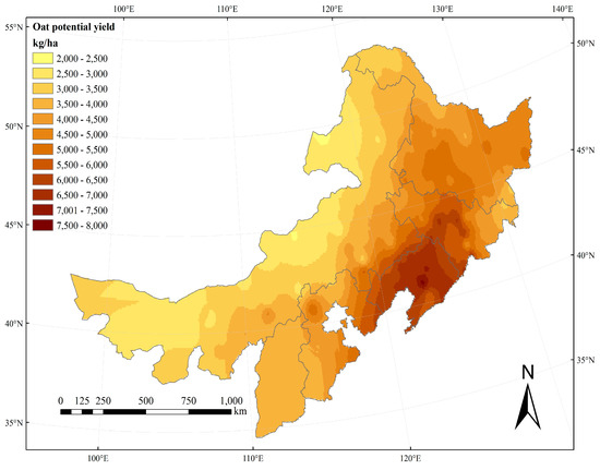 The spatial pattern of potential yield for rain-fed oat in North and Northeast China.