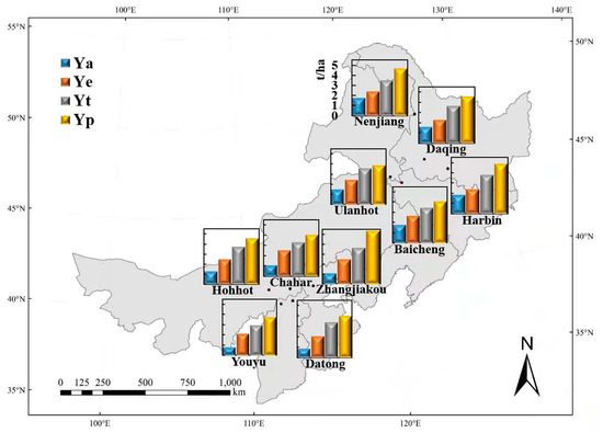 Due to inappropriate fertilization, relatively old crop varieties, and low levels of agronomic management, farmers’ Ya was significantly lower than Yt and Ye, which should be paid more attention if we want to close the yield gaps. In NC, higher Yt, Ye, and Ya values were mainly found in stations with higher latitudes (Zhangjiakou, Hohhot, and Chahar Cities, with values exceeding 3369 kg/ha, 2317 kg/ha, and 989 kg/ha, respectively) (Figure 4). However, in NEC, the spatial patterns of Yt, Ye, and Ya were relatively complicated. Higher Yt values were primarily found in Heilongjiang Province in NEC (Harbin and Daqing Cities, with values higher than 3571 kg/ha). Higher values of Ye were primarily found in Jinlin and Inner Mongolia of NEC (Baicheng and Ulanhot Cities, with values higher than 2396 kg/ha). Yet higher values of Ya were mainly distributed in Heilongjiang and Jilin Provinces of NEC, where have more abundant rainfall and relatively fertile soil (Figure 4).
