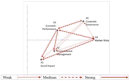 Figure 1 visualized that corporate governance (A5), economic performance (A3), and market risks (A4) are categorized in the cause group, while the social impact (A1) and environmental management (A2) are categorized in the effect group. Specifically, market risk possesses low effect on corporate governance and has a medium effect on economic performance. Economic performance as well is affected by corporate governance and market risks in medium degree. Furthermore, market risks are affected by corporate governance in a modest way, and it has medium relations with economic performance.