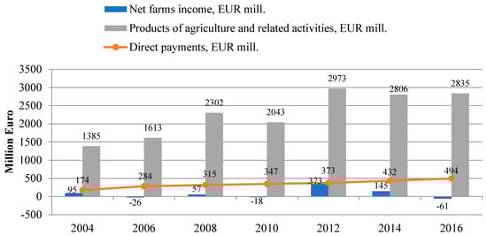 Despite its importance for the Lithuanian economy and society, the agricultural sector faces increased risk and financial volatility [6]. Economic indicators, representing farming results in Lithuania (considering the period of 2004–2016) show that direct payments play a crucial role in maintaining the farm income (Figure 1).