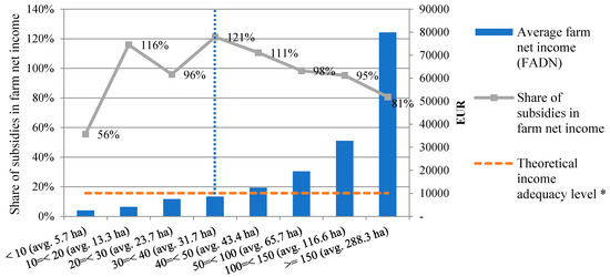 Average farm net income across different farm size groups in Lithuania for 2010–2016 (FADN data). * The theoretical income adequacy level is calculated as the average net salary of two full-time persons employed in agriculture for 2010–2016 (Lithuanian family farms employ two persons on average), Statistics Lithuania.