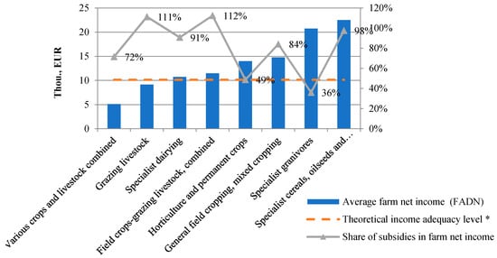 Figure 3 shows the average farm income level in Lithuania across different farm types for 2010–2016 (including all farms in Lithuania according to FADN). The lowest income levels are observed for various crops and livestock combined, grazing livestock farms. The UAA in these farms is small, ranging from 17 to 25 ha. It is these farms that fall below the viability threshold (the theoretical income adequacy level) and should be prioritized in the sense of support.