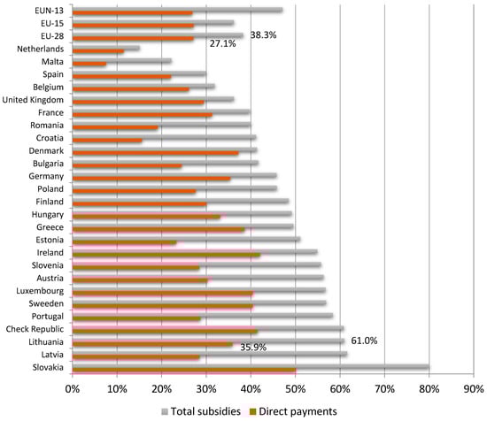 Share of direct payments and total subsidies in agricultural factor income (2011–2015 average) [27]. Notes: Agricultural factor income measures the income generated by farming, which is used to remunerate borrowed or rented factors of production (capital, wages and land rents) as well as own production factors (own labour, capital and land). EUN-13—new member states, since 2004 there have been 13 new countries added to the European Union: Bulgaria, Croatia, Cyprus, Czech Republic, Estonia, Hungary, Latvia, Lithuania, Malta, Poland, Romania, Slovakia and Slovenia.