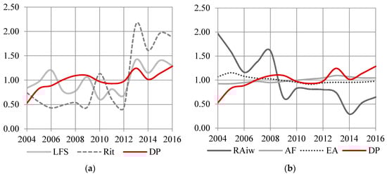 Dynamics in the values of the TOPSIS-based indicators (mean-normalized) for Lithuania, 2004–2016. (a) dynamics in the values of LFS, Rit and DP indicators; (b) dynamics in the values of AF, EA, RAiw and DP indicators.