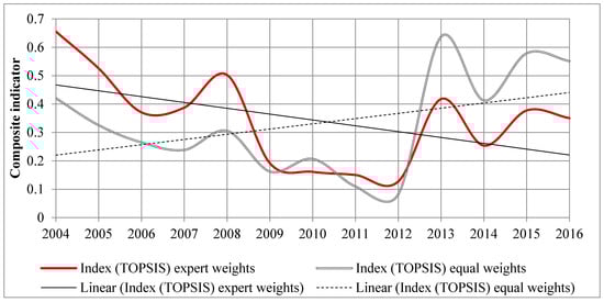 Then, the total distance of each comparative solution (i.e., the values of the indicators for 2004–2016) to the best solutions V* and the distance to the worst solutions was calculated according to the formulas [48]: