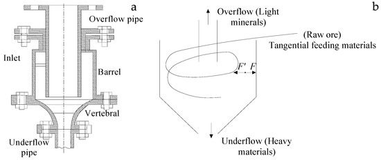 The full-size water separation method and process. (a) The tri-cone coal slurry cyclone, (b) Schematic diagram of water-only cyclone.