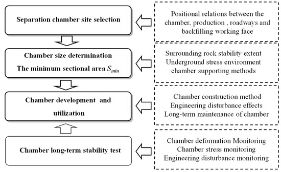 The design process of underground separation chambers is illustrated in Figure 3, taking the location selection of the coal-waste system in the Tangshan Minging Branch of Kailuan Group as an example. Every year, 900,000 t gangues are produced underground in the Tangshan Mining Branch. To solve the problem of the underground discharge of gangues, the underground coal-waste separation system was established in the crosshead between 502 coal bunker and 5021 coal bunker in Tangkou coal mine. It has achieved a reasonable connection and matching with the existing production system and the gangue backfilling system. Moreover, it is reasonable in terms of the mine underground engineering, coal gangue transportation distance and separation chamber spatial distribution. Based on comprehensive consideration of the stability of the surrounding rocks, the underground stress environment and the maintenance of surrounding rock support, the underground coal-waste separation system was determined, which consisted of six roadways, seven chambers, one refuse bin, three milling coal holes and thirteen crossing points. The moving sieve jig jigging chamber’s length, width and height are 25.8m, 6.2m and 9.27m, respectively and is located in the large-section chamber. Considering the chamber construction design and difficulty level of support, the numerical simulation was used for analysis. Finally, the excavation of the separation chamber used the descending construction method and the combined support of anchor net spray, brick laying and inverted arch.
