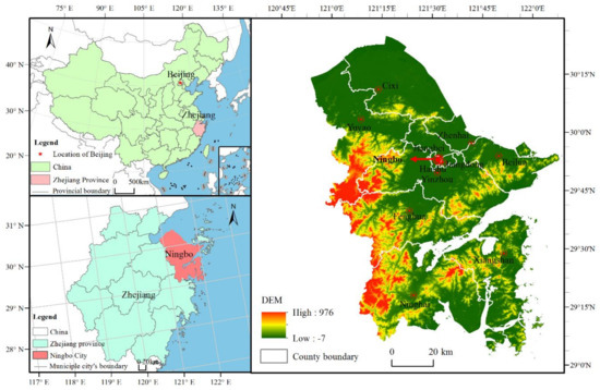Ningbo city is located within the intersection of the national “golden waterway” of the Yangtze River and the north–south sea transportation route in China (Figure 1). It is a prefectural-level city and contains 11 county-level administrative regions: Haishu, Jiangbei, Jiangdong, Beilun, Zhenhai, Yinzhou, Fenghua, Yuyao, Cixi, Xiangshan, and Ninghai. It has a subtropical climate with hot and humid summers and relatively dry winters. The mean annual temperature is about 16.5 °C, and the mean annual rainfall is about 1440 mm. The plum rain of the Asian monsoon in June and the typhoons that occur annually between August and October are the main sources of water for the city, and fluctuations in these events may lead to flooding or droughts [43]. Topographically, the average elevation of this region is very low, with more than 50% of its on-land territory being less than 50 m above sea level.