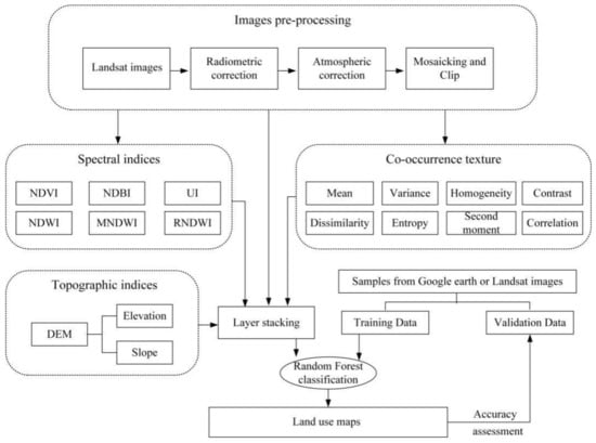 A detailed flowchart of land use mapping is presented in Figure 2. RF classification is an efficient tool for land use mapping [41,48], and was used to map land use in Ningbo.