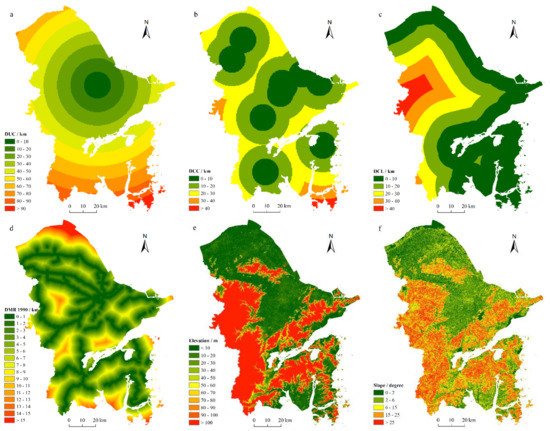 Groups of different spatial attributes in Ningbo city: (a) Distance to city center (DUC), (b) distance to county center (DCC), (c) distance to coastline (DCL), (d) distance to main roads (DMR), (e) elevation, and (f) slope.
