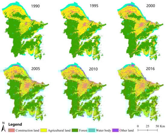 Ningbo is also known as a rapidly developing port city. In 1987, it became a separate planning city and was granted the same authority as the provincial governments for financial administration. Subsequently, both its economy and urbanization developed rapidly. In 1990, the GDP of Ningbo was 14.1 billion RMB, and the urbanization rate was 38.5%. In contrast, in 2016, its GDP reached 854.1 billion RMB, an almost 60-fold increase, and the urbanization rate increased to 71.9%, 33.4% higher than in 1990. The population in Ningbo has also continuously increased from 4,577,000 in 1990 to 5,910,000 in 2016 [44]. The Ningbo-Zhoushan port, which has become the largest port in the world in terms of cargo tonnage (since 2012), is regarded as having considerably contributed to the development of Ningbo city [45]. Concurrently, construction land expansion has become one of the major land use change trajectories in Ningbo city, and has mainly been achieved through the conversion of agricultural land and forests. However, the implementation of farmland protection policies have proven to be effective in controlling the expansion of construction land and in protecting agricultural land from being occupied by non-agricultural use [46], so manifestations of land use change may be different in Ningbo city over time.