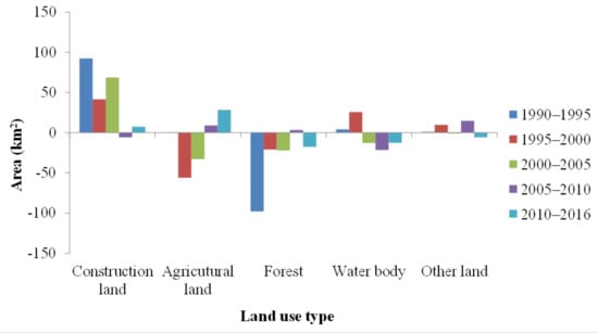 According to Table 4 and Figure 4, forest and agricultural land were the two major land use types in Ningbo city in 1990, accounting for 84.48% of the total area. However, the total proportions of forest and agricultural land roughly decreased during the 1990–2016 period and accounted for 73.52% of the total area in 2016. Specifically, forest area continually decreased during the study period, and the proportions decreased from 57.5% in 1990 to 48.9% in 2016. Agricultural land experienced a significant shrinkage during 1990–2005, from 2515.91 km2 in 1990 to 2074.25 km2 in 2005: However, it recovered during 2005–2016 and reached 2289.27 km2 in 2016, which was still 226.64 km2 less than in 1990. Besides the two major land use types, construction land area continually increased, from 531.51 km2 in 1990 to 1543.87 km2 in 2005, and then remained roughly stable during 2005–2016. Since 2005, construction land has been the third-largest land use type, accounting for more than 16% of the total area in Ningbo city. With respect to water bodies and other land use types, the former expanded on a smaller scale (1.6 km2) in the first 10 years of the study period (1990–2000) and then shrunk to 8.66 km2 in 2016, 1.04 km2 less than in 1990. Other land use types roughly expanded during the study period, but only accounted for a small percentage of the total area (less than 1.5%).