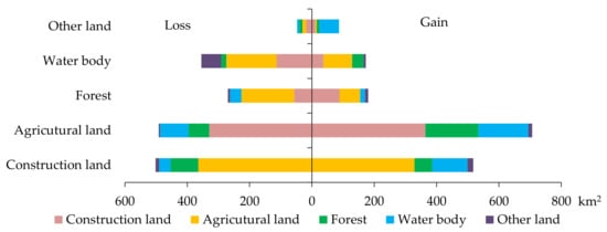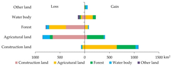 Given the significant difference in land use in Ningbo city before and after 2005, the land use transitions of the two time periods (1990–2005 and 2005–2016) were analyzed using land use transition matrices. During 1990–2005, land use transitions occurred in about 20% of the total area (1865.11 km2) of Ningbo. Land gains were mainly attributed to the expansion of construction land, followed by expansions of agricultural land and water bodies (Figure 6). New construction land was mainly reclaimed from agricultural land and forest, new agricultural land was mainly reclaimed from forest, and new water bodies were mainly reclaimed from agricultural land and forest (Figure 5). Land losses were mainly attributed to decreases in agricultural land and forest (Figure 6). About one-third (33.9%) of agricultural land and about one-seventh (14.7%) of forests were converted to other land use types. Agricultural land converted to construction land occupied 73.9% of the total area experiencing agricultural land loss. In comparison, 48.1% and 42.9% of lost forest was converted to construction land and agricultural land, respectively. Overall, construction land expansion from occupying agricultural land was the major feature of land use change; and transitions from agricultural land to construction land, from forest to construction land, and from forest to agricultural land were three major types of land use changes, accounting for 73.2% (1365.01 km2) of the total changed area during 1990–2005.