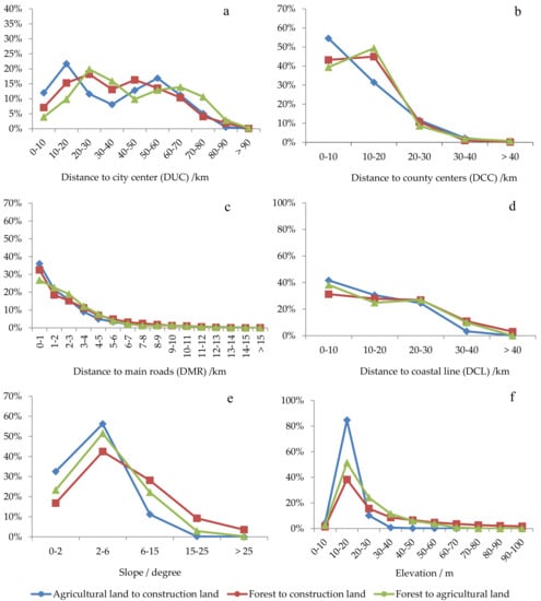 With respect to the divisions of groups for spatial attributes, the DUC, DCC, and DCL groups were divided using an interval of 10 km. The DMR group was divided with an interval of 1 km. Slopes with values of 2, 6, 15, and 25 were used as dividing points according to the technical specifications of Chinese land use surveys. As most land use change activities have occurred in areas with elevations less than 100 m, we emphasized the spatial variations of land use change in these areas, with an interval of 10 m (Figure 3).