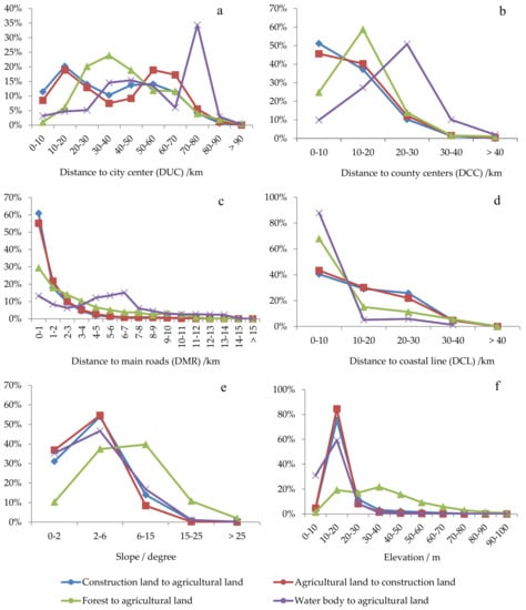 For the spatial attributes affecting land use change, previous studies have mostly focused on four attributes: Physical factors, socioeconomic factors, neighborhood factors, and land use policy factors [56,57]. In this study, we emphasized the spatial patterns of land use change by physical and socioeconomic attributes. Two topographic attributes (i.e., slope and elevation) were selected that have mostly been considered physical factors in previous studies [57]. Proximity attributes were regarded as good representations of socioeconomic factors [57,58,59], and in this study, we selected four proximity attributes: Distance to urban center (DUC), distance to county centers (DCC), distance to main roads (DMR), and distance to coastline (DCL). Specifically, DCL was considered together with other attributes (DCL has seldomly been included in previous studies) because there is a series of ports along the coastline that may also play a significant role in land use change.
